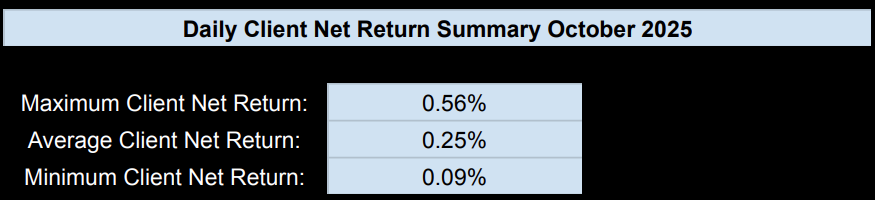 The crypto arbitrage premium remained stable within the 0.8%–0.9% range throughout October, providing the trading desk with consistent trading opportunities and resulting in a strong daily net return performance, with a peak of 0.56% and an average of 0.25% during the month.